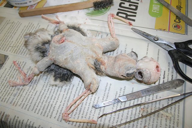 Fleshed skin with wings and legs inverted and skull cleaned. Large eyecups are cleaned and left in the skull. The skin is washed and dried to get it ready to mount.